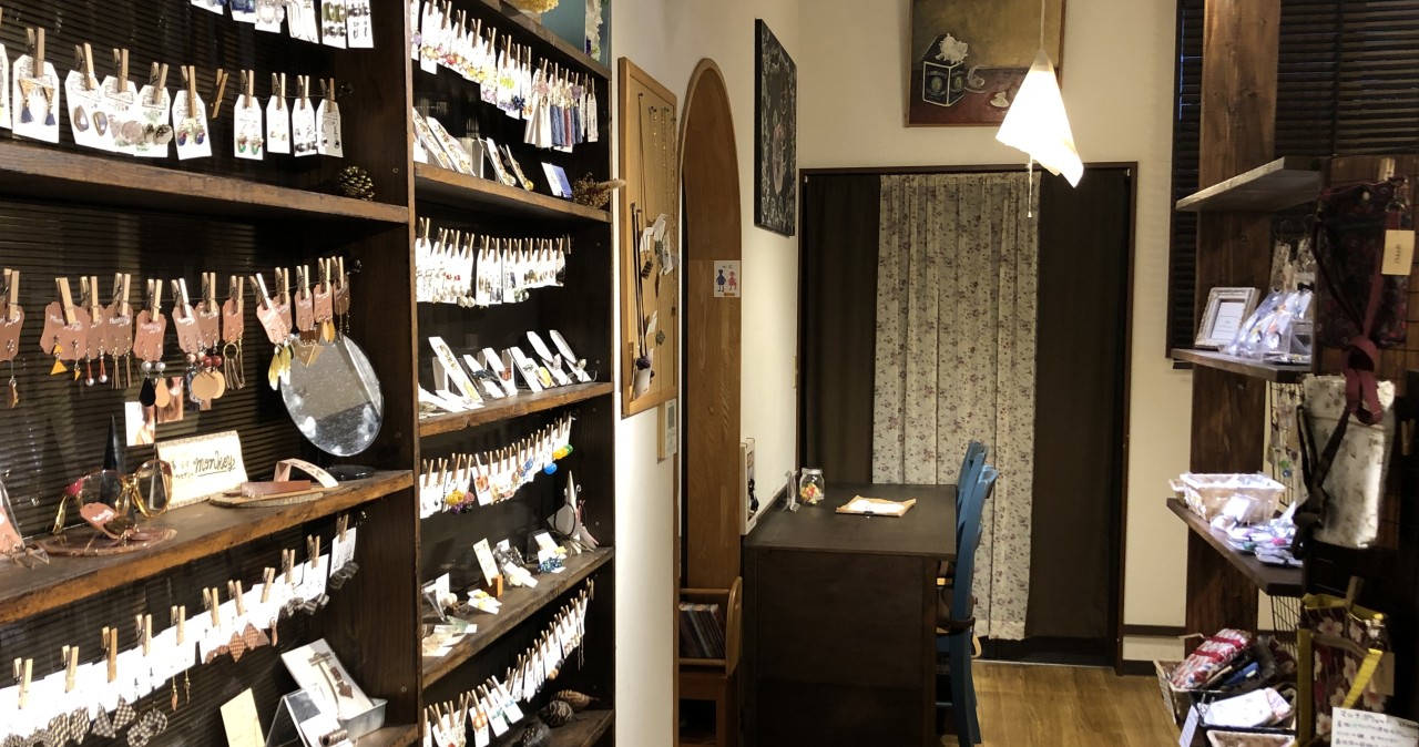 ショップは手作りアクセサリー、和服地の小物雑貨、などの販売コーナーです。
